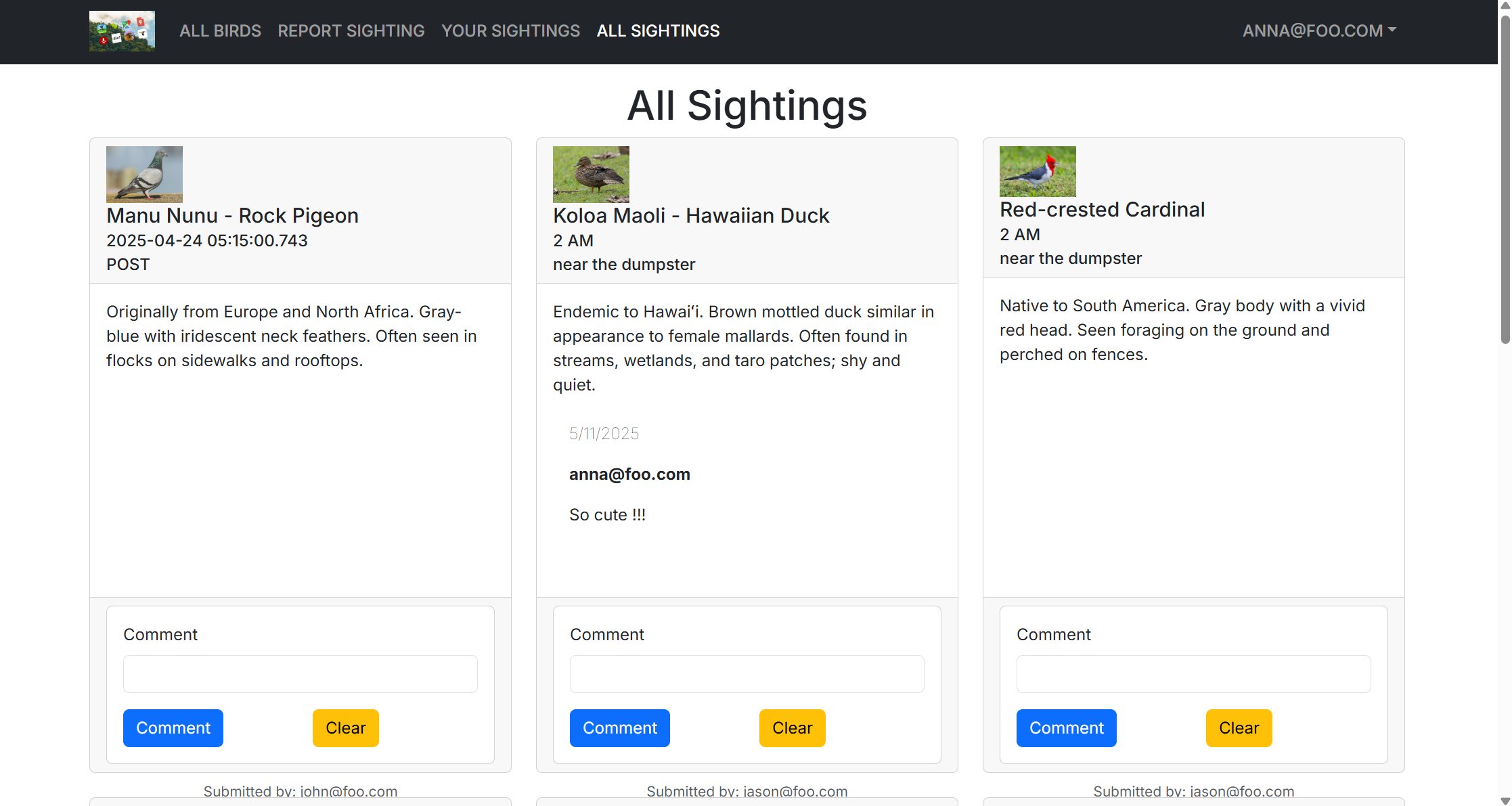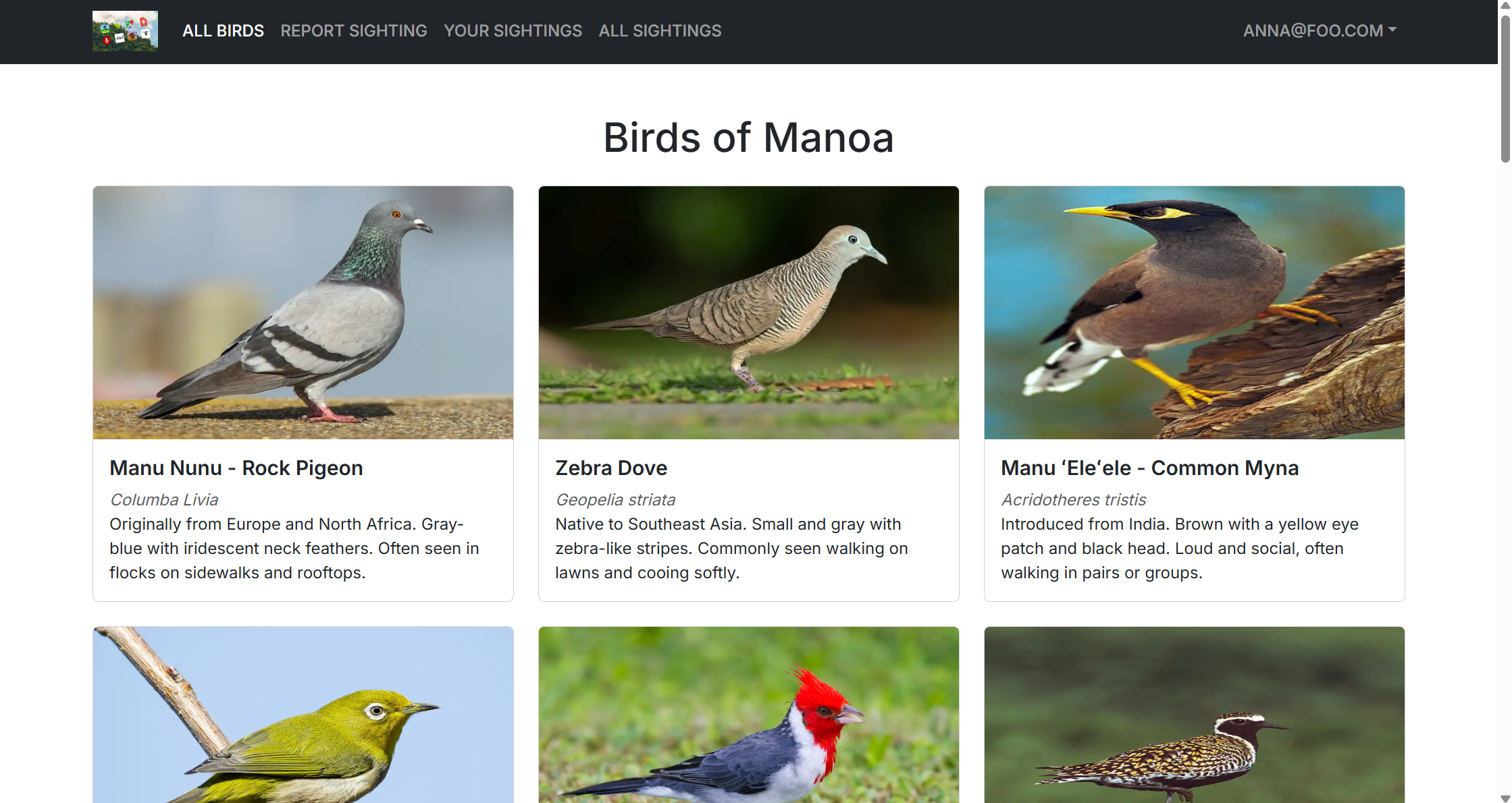 The final project for ICS 314 software engineering was to create a Manoa-specific website in groups, using the software engineering skills we had learned throughout the course. My groups chose to create a website for bird watchers in Manoa. The website includes pages to discover the variety of birds that may be seen in Manoa, create an account or sign in, report a sighting, and view and comment on your own and other user’s sightings. The unique aspect of this website compared with preexisting ones is the social aspect. Many bird watchers have a specific bird they have not yet seen or would like to see again, and would be interested in seeing where others have reported that bird can be seen in Manoa.